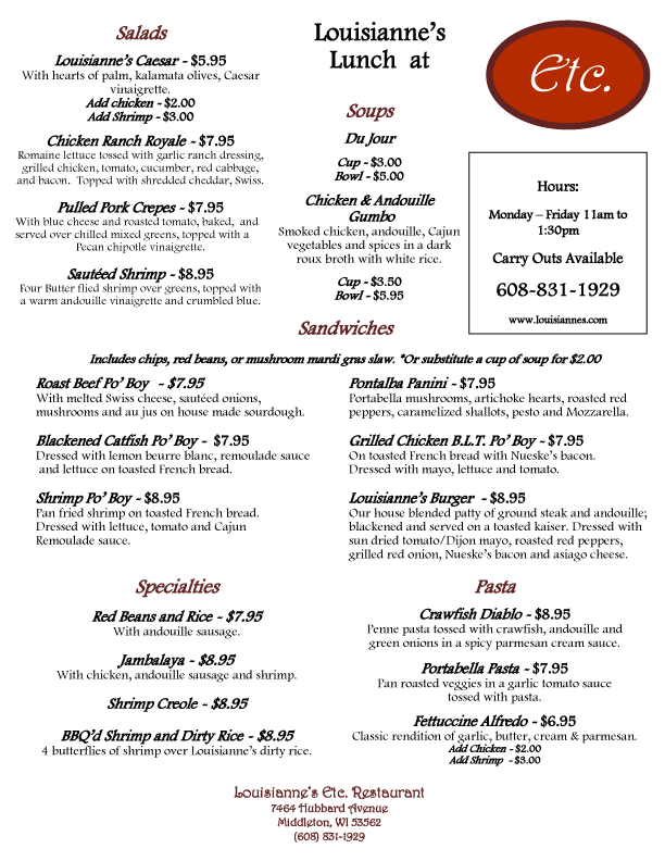 Louisianne's Etc. Lunch Menu If you prefer a printable menu Click Here